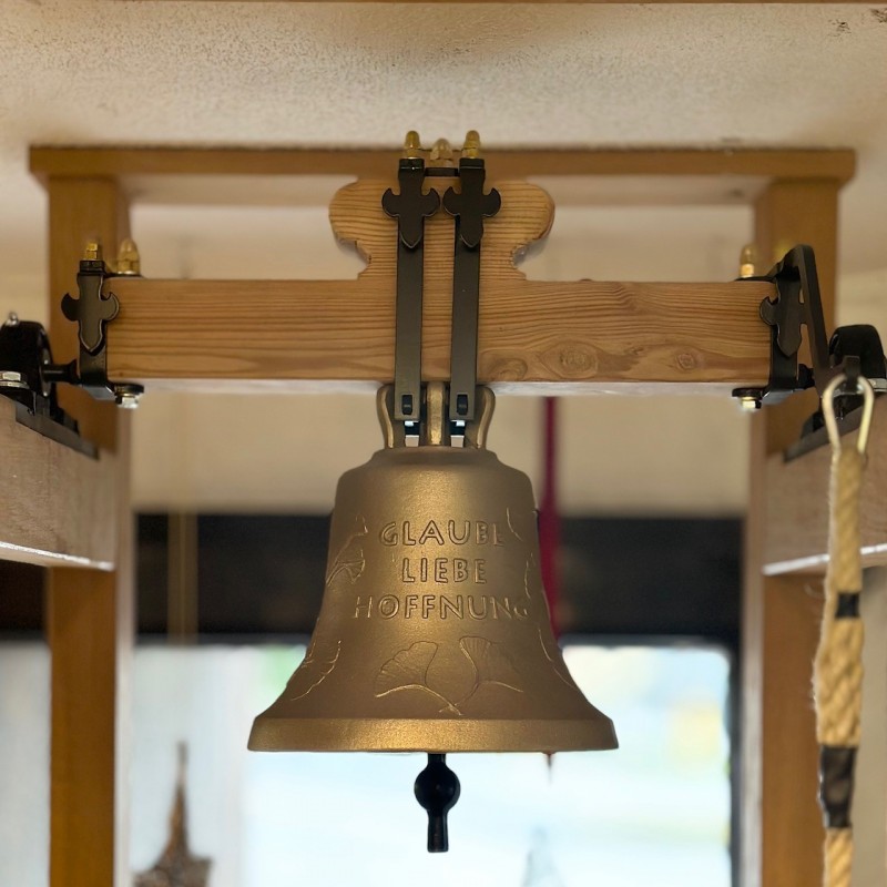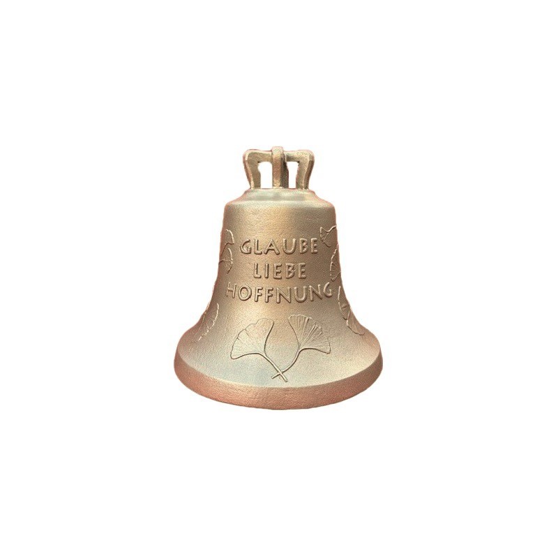 Die Glocke zieren rundherum Ginkoblätter sowie der Schriftzug "GLAUBE LIEBE HOFFNUNG".