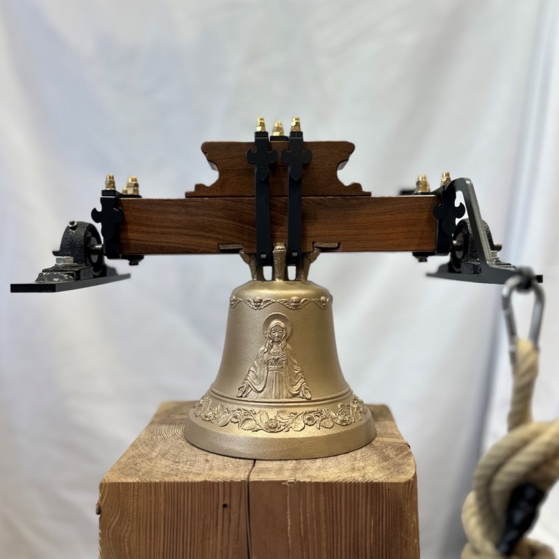 Das Zubehör umfasst den Klöppel sowie Holzjoch (Nussbaum) mit Läutearm und Seil.