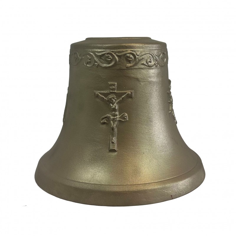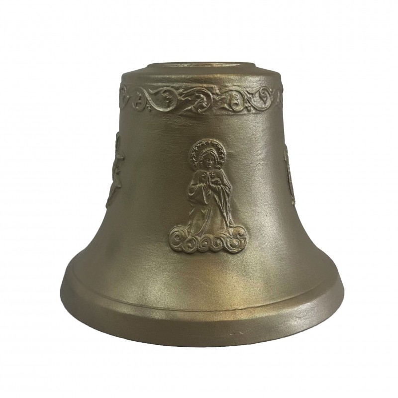 Diese Tiroler Glocke ziert oben eine Blumenrake. Vorne schmückt sie ein Edelweiß, an den Seiten ein Jesus sowie Marienbild